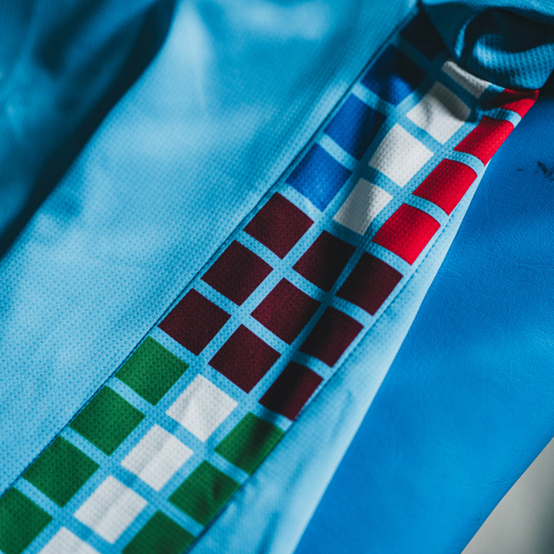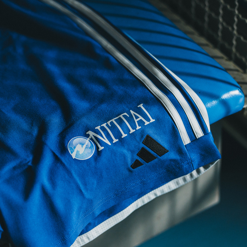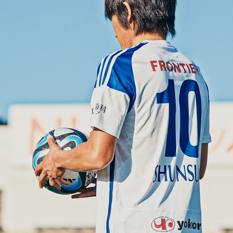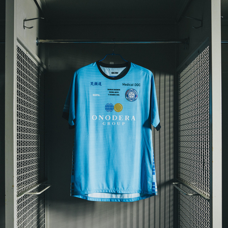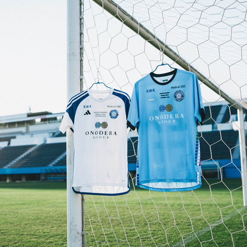 横浜FCを長きにわたり支えた選手および共にプレーをした戦友たちで構成される「YOKOHAMA FC FRIENDS」の着用ユニフォーム。クラブカラー「HAMABLUE」をベースに、サイドの部分には所属した6クラブへの感謝を伝えたいという中村俊輔氏の想いを汲み取り、6クラブのクラブカラーを年代順に並べ、プロ26年の歴史を表現。俊輔氏が愛したもうひとつの背番号「25」を背負い、26年間の想いが詰まったユニフォームを纏う。