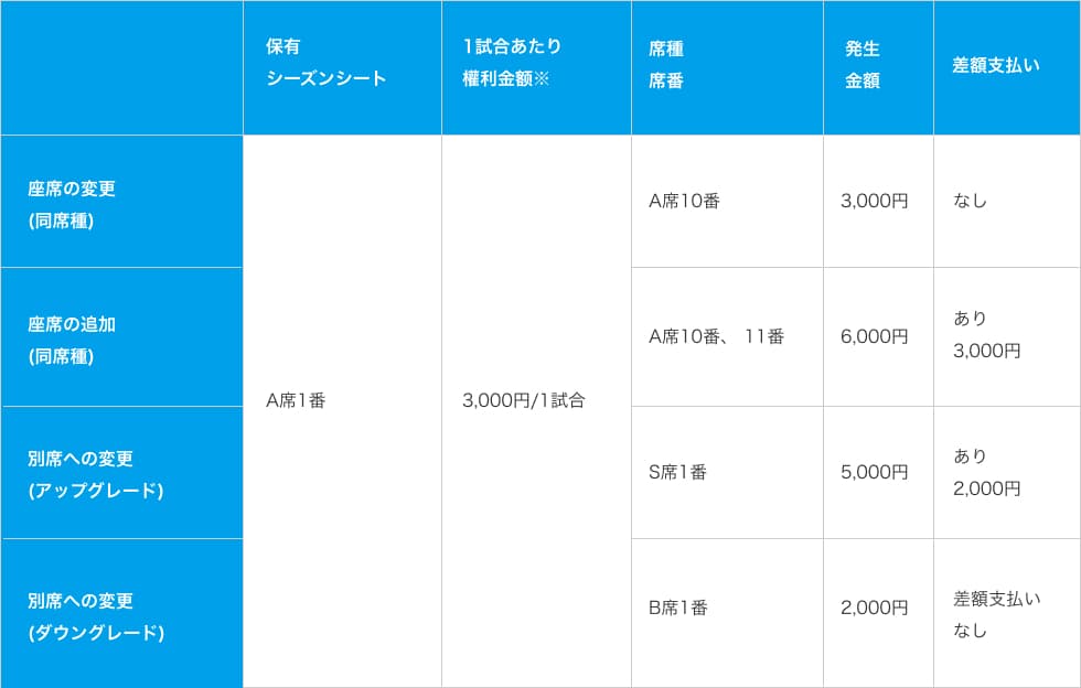 | その他・注意事項 | ・変更対象試合は同一の試合のチケットとなります。別の試合に変更することはできません ・1回のお手続きでシーズンシートの権利金額を使用できるのは1席のみとなり、2席以上のシーズンシートの権利金額を合算して同時に使用することは出来ません ・シーズンシート席変更成立後に、元の席は一般販売されます。元の席での観戦、取引のキャンセルはできません ・ダウングレードの場合、差額の返金はございません。ダウングレードであっても、権利金額は手数料に適用されないため、手数料が発生します ・シーズンシート席変更成立後の座席を変更することはできません ・発券方法はQRチケットのみです ・決済方法はクレジットカード、d払い、楽天ペイのみです ・Jチケキャンペーンや割引クーポンとの併用はできません |