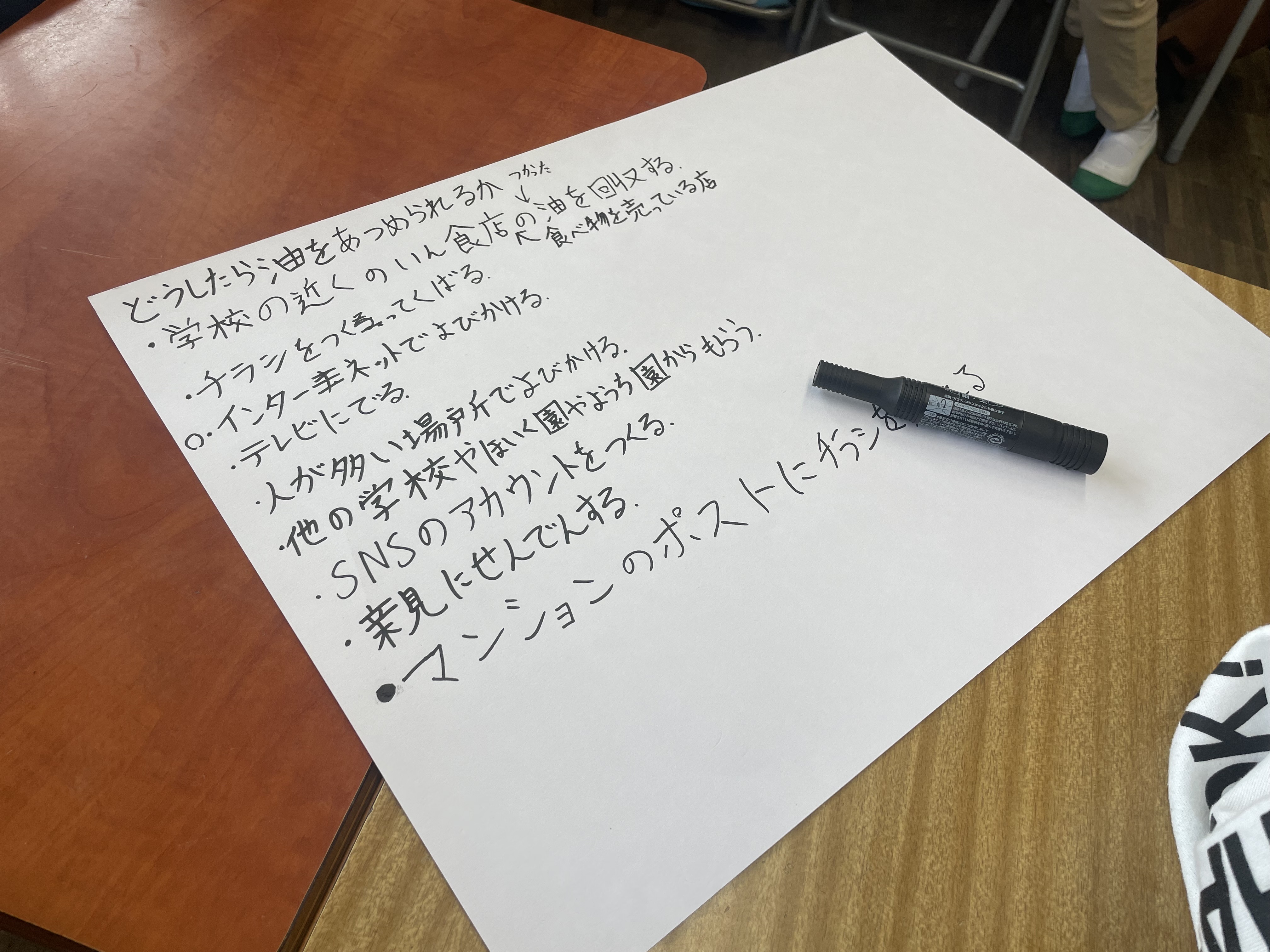 授業では、使い終わった油(廃食用油)がどうやって飛行機の燃料になるかを知った児童の皆さんが、「廃油が未来の燃料に変わる!」という事実に目を輝かせ、高い関心を示していました。授業の最後には、「私たちができること」をテーマに、お家での廃油回収の協力や、SAFを広めるためのポスター・イベント企画などの具体的な行動プランを考えました。