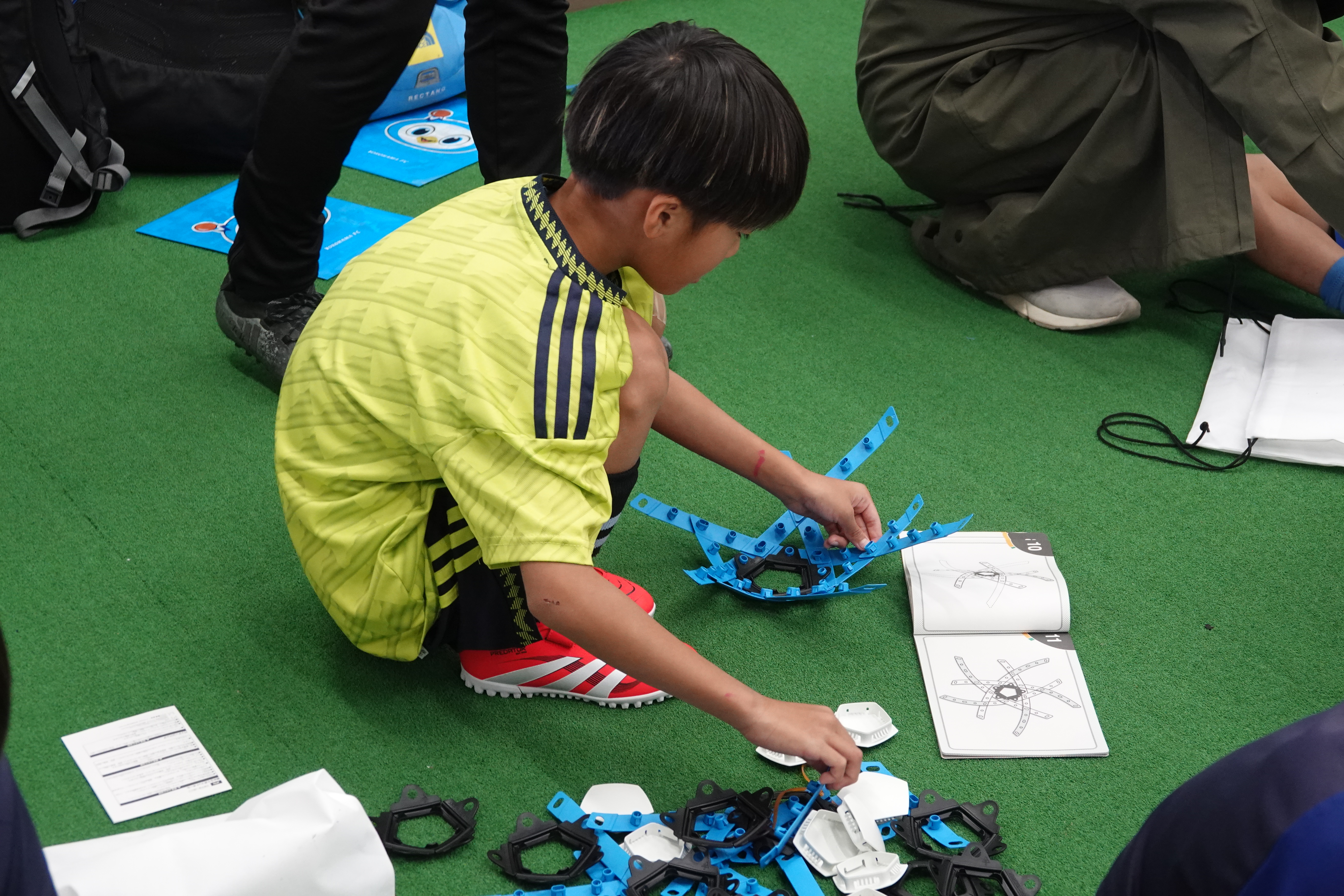 最初は、サッカーボールを自分で作るということに戸惑っていた子どもたちでしたが、作業に取り掛かると夢中になって作成していました。完成したボールを実際に蹴ってみると、通常のサッカーボールと変わらない感触に、驚きの声が上がっていました。