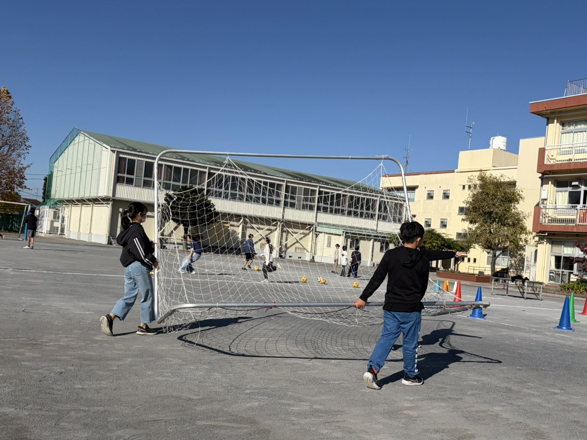 11月中旬からは、サッカーブースを実践してみることに。「安全・安心」、「楽しく」を重視しながらルールや役割、レイアウトなどを見直しました。児童の皆さんは、園児を想定して説明やルールを考えることが難しいようで、アドバイスしたり一緒に考えたりしながら少しでも園児に楽しんでもらえるよう、開催日に向けて一生懸命取り組んでいます。