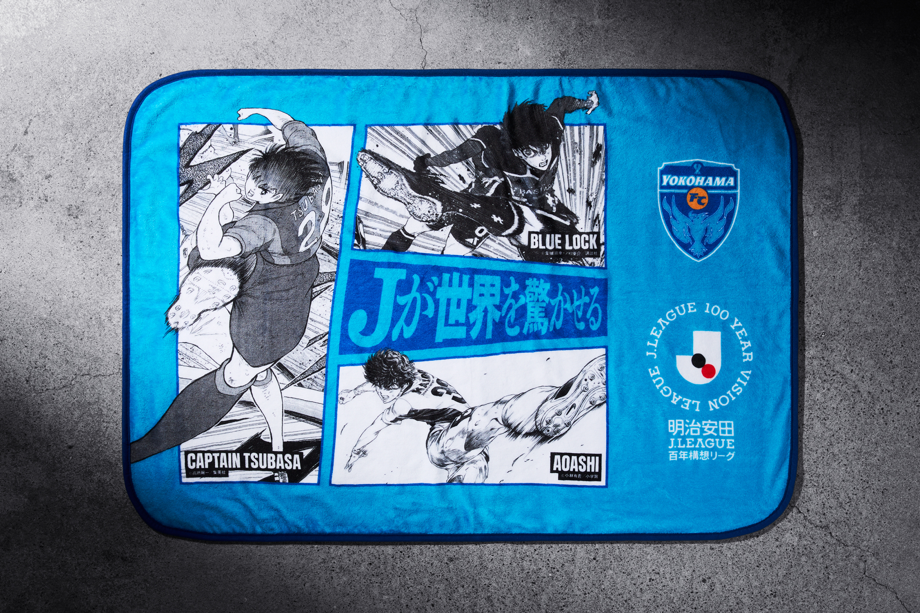 本企画は、シーズン移行に際して開催される特別な大会である「明治安田Jリーグ百年構想リーグ」を記念して実施されるものです。ブランケットのデザインには、日本が世界に誇るサッカー漫画「キャプテン翼」をはじめ、近年国内外で絶大な人気を誇る「ブルーロック」「アオアシ」の3つの作品との史上初のトリプルコラボレーションが実現しました。シーズン移行という大きな転換点を経て、Jリーグが今後さらに結果を出し、世界を驚かせるという意思を、3作品の主人公が放つ力強いシュートと重ね合わせ、メッセージとして発信していきます。