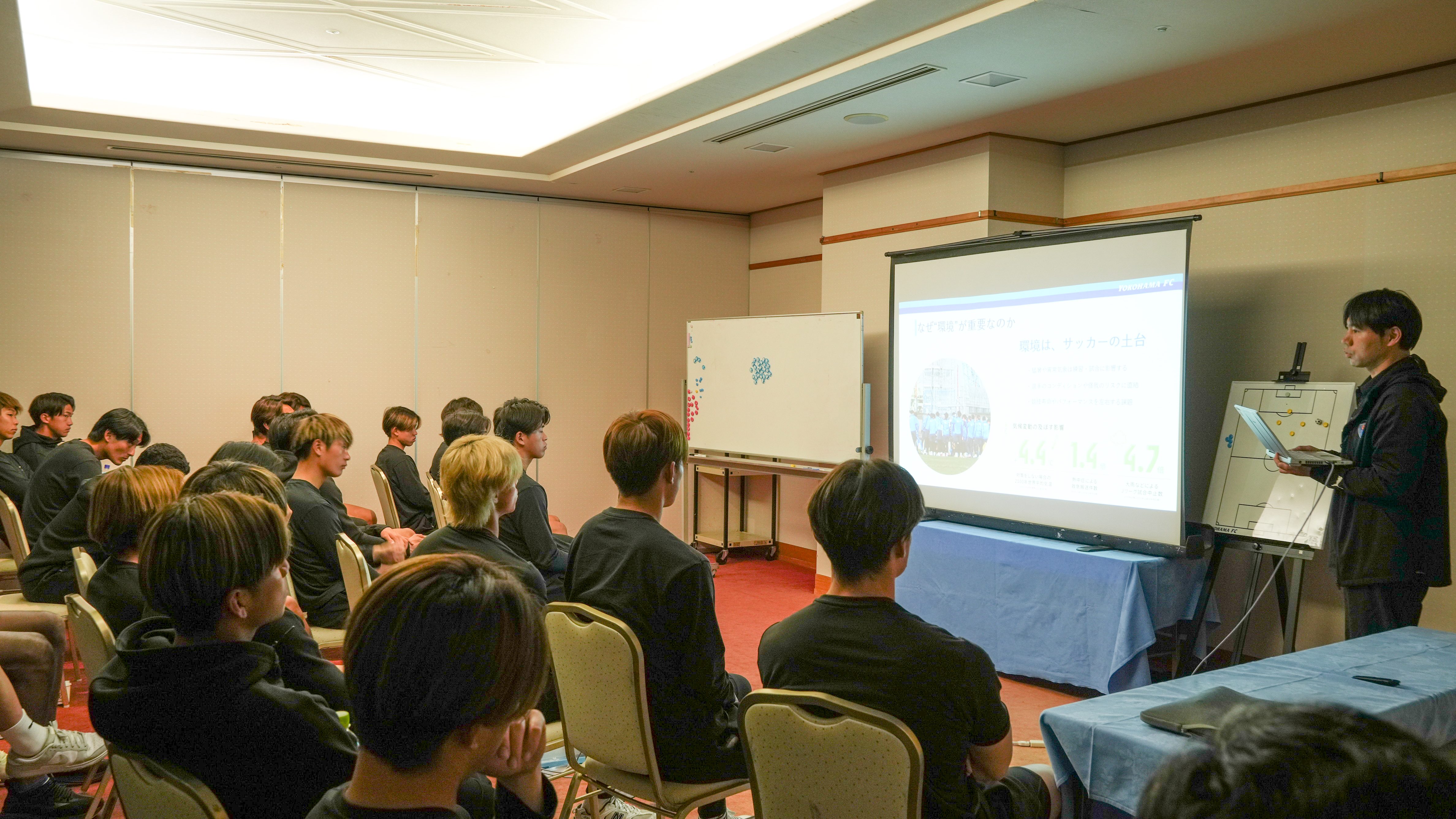 次に、選手・スタッフが、気候変動が競技や日々の準備に与える影響を「自分事」として捉えるための研修を行いました。クラブ全体の取り組みとして、事業部門からトップチームまで。横浜FCでは、共通の価値観をもとに段階的に取り組みを進めています。