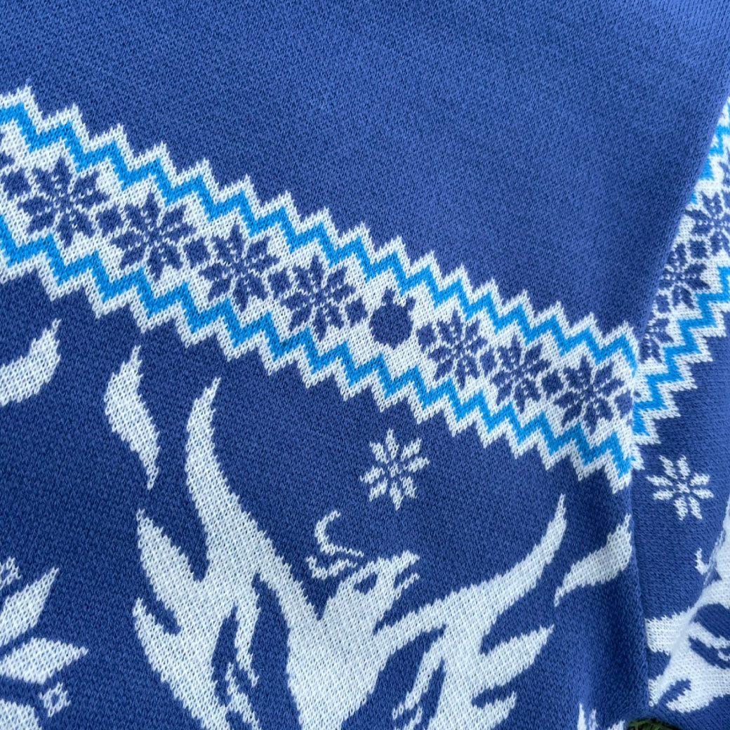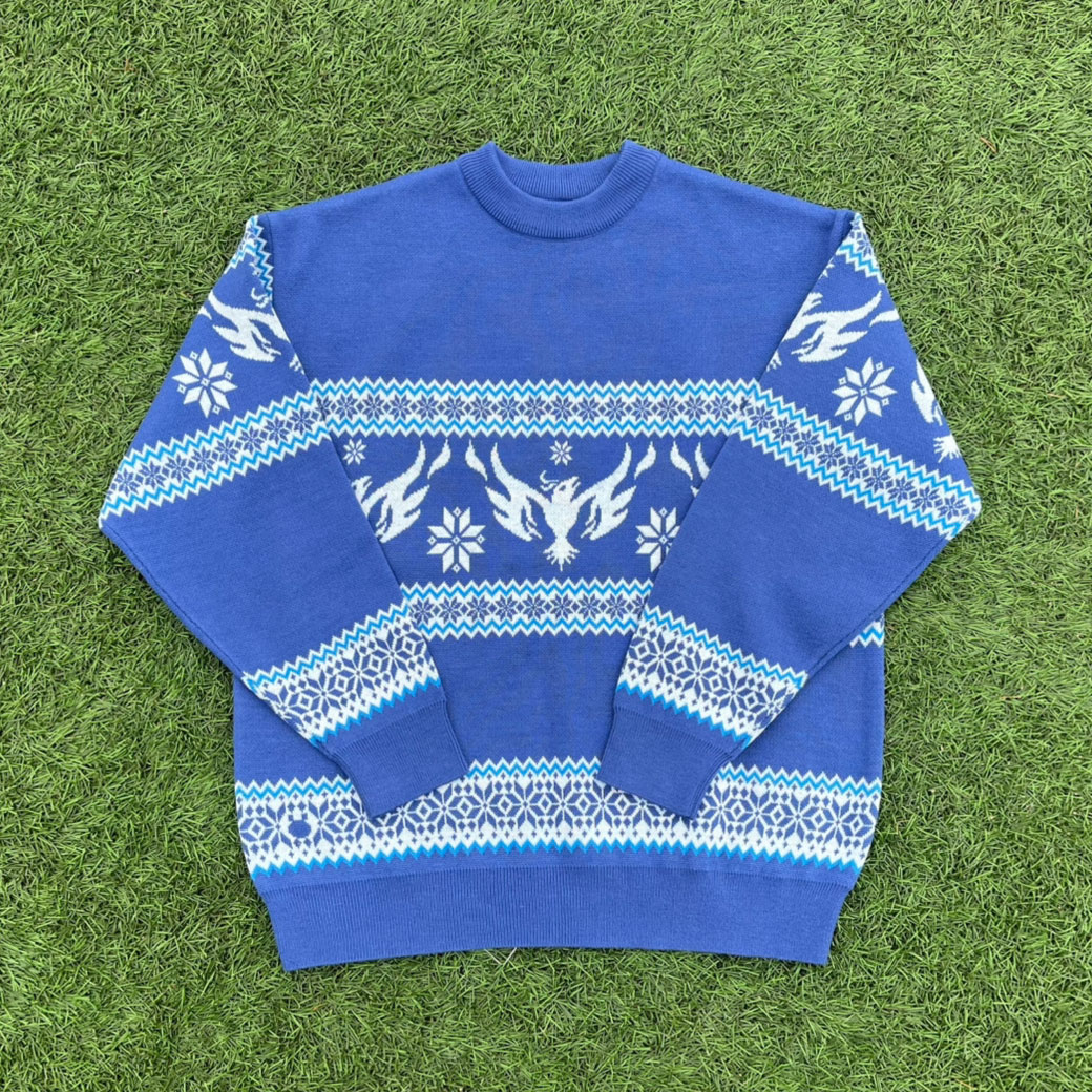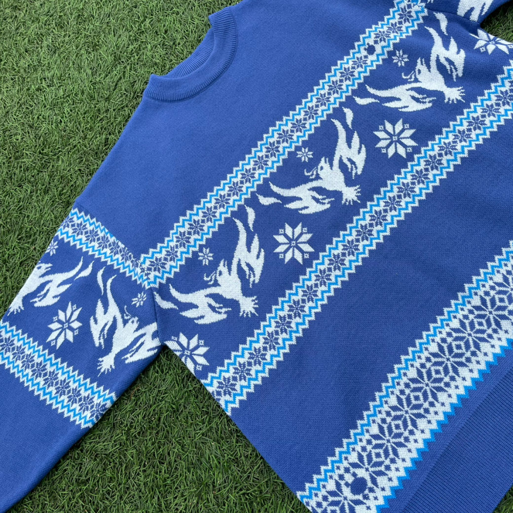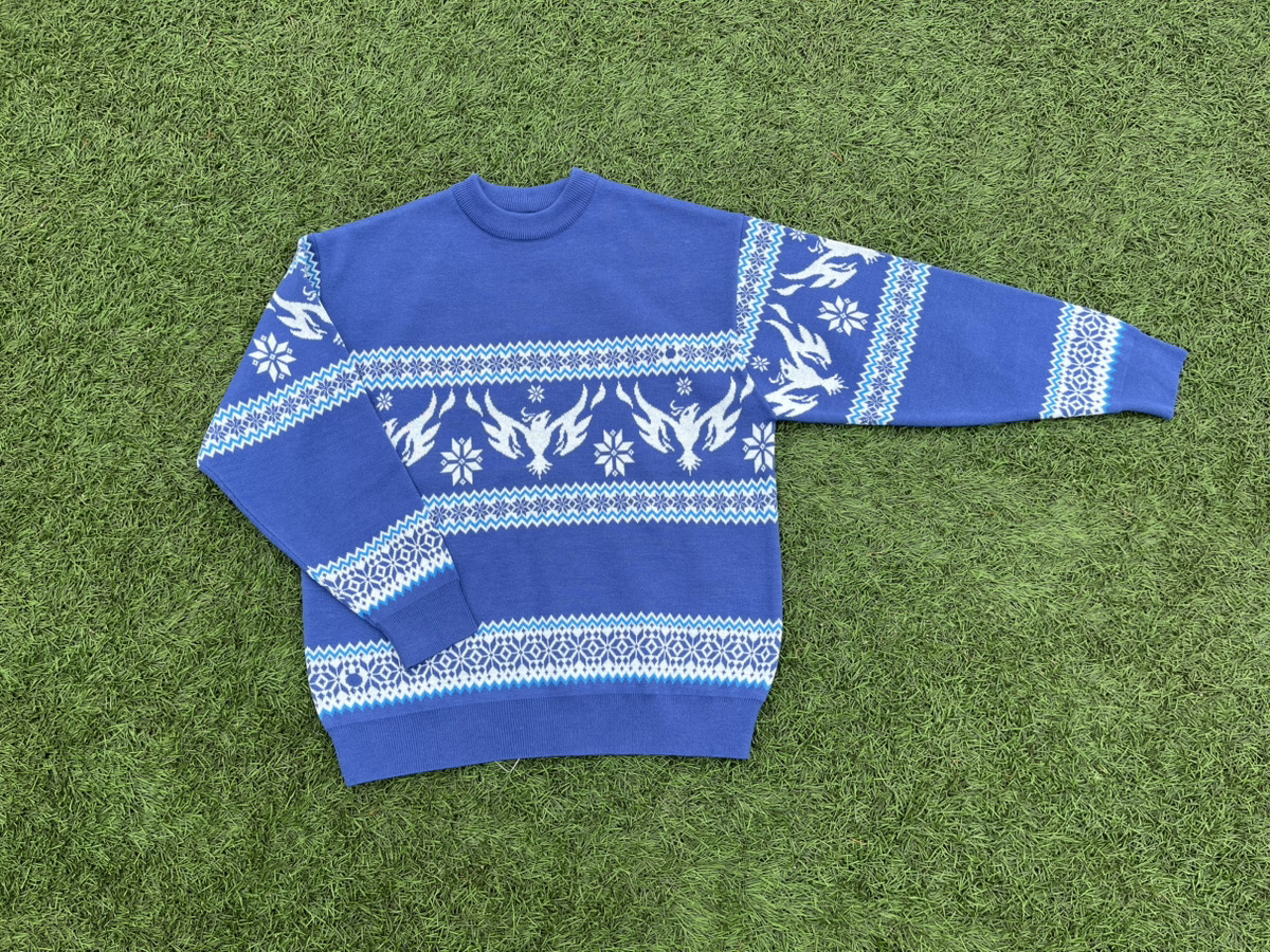 セーター全体には、繊細な雪の結晶モチーフと横浜FCの象徴である「フェニックス」を北欧風の幾何学模様でアレンジ。フリ丸が雪の結晶に中に隠れているのがポイント!