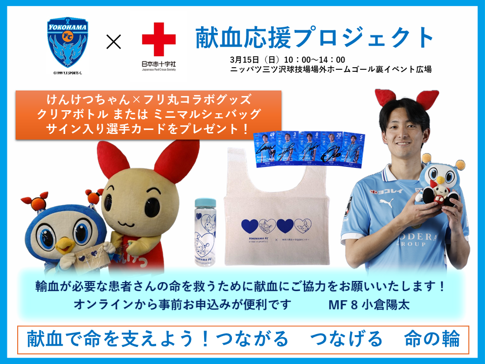 横浜FCは、Jリーグ「シャレン!」社会連携活動の一環で、神奈川県赤十字血液センターと連携し「横浜FC×赤十字 献血応援プロジェクト」を実施します。