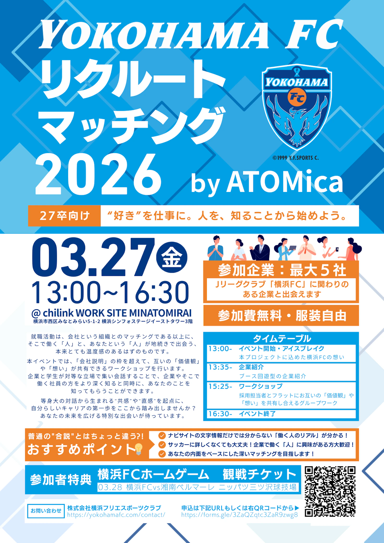 この度、2027年卒業予定の学生の皆様と横浜FCを支えていただいているパートナー企業様を繋ぐキャリアイベント「横浜FC リクルートマッチング2026 by ATOMica」を開催いたします。