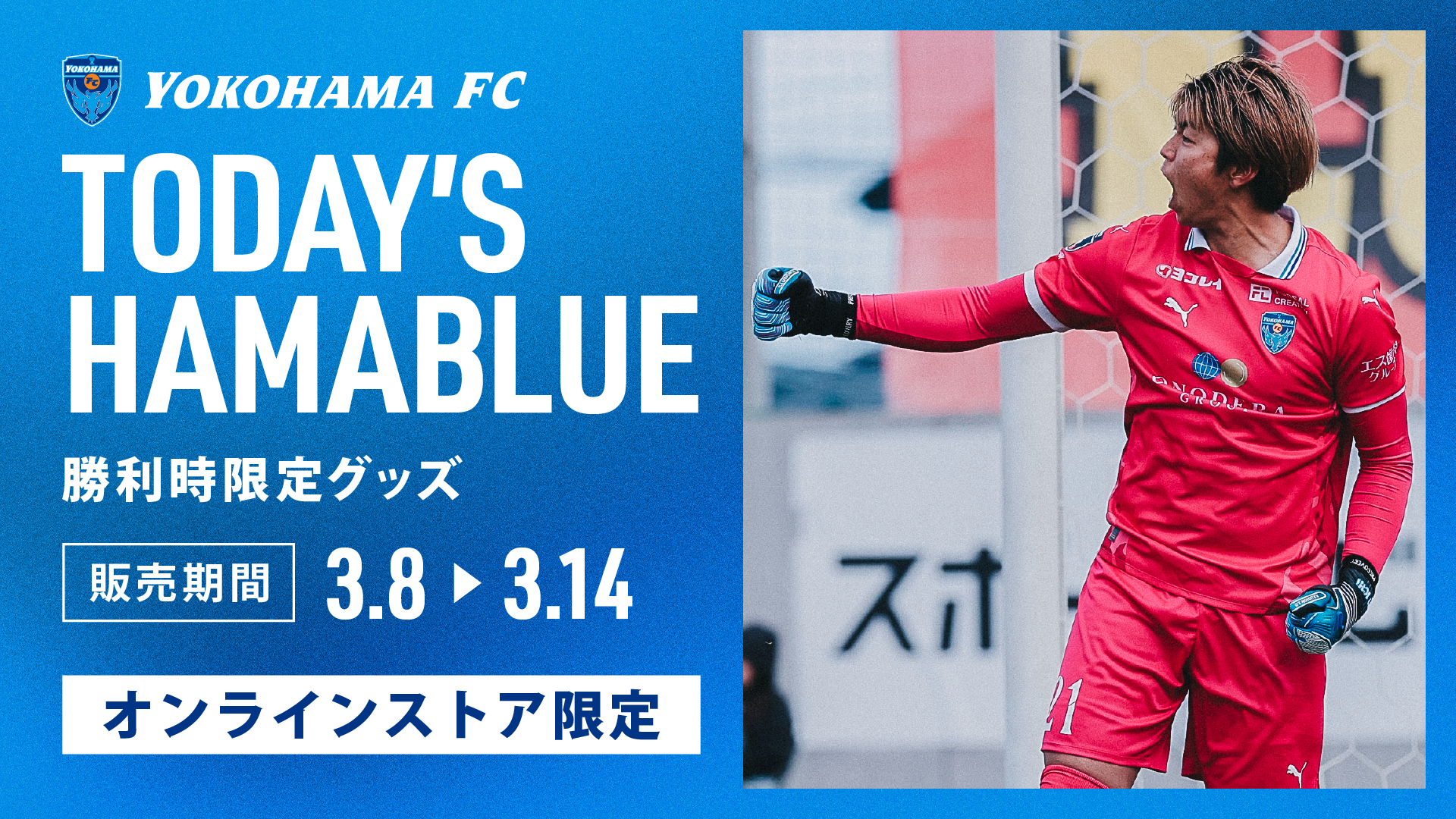 今シーズンもホームゲーム・アウェイゲームともに勝利時限定で「TODAY'S HAMABLUEグッズ」を横浜FC公式オンラインストアにて受注販売しています。
