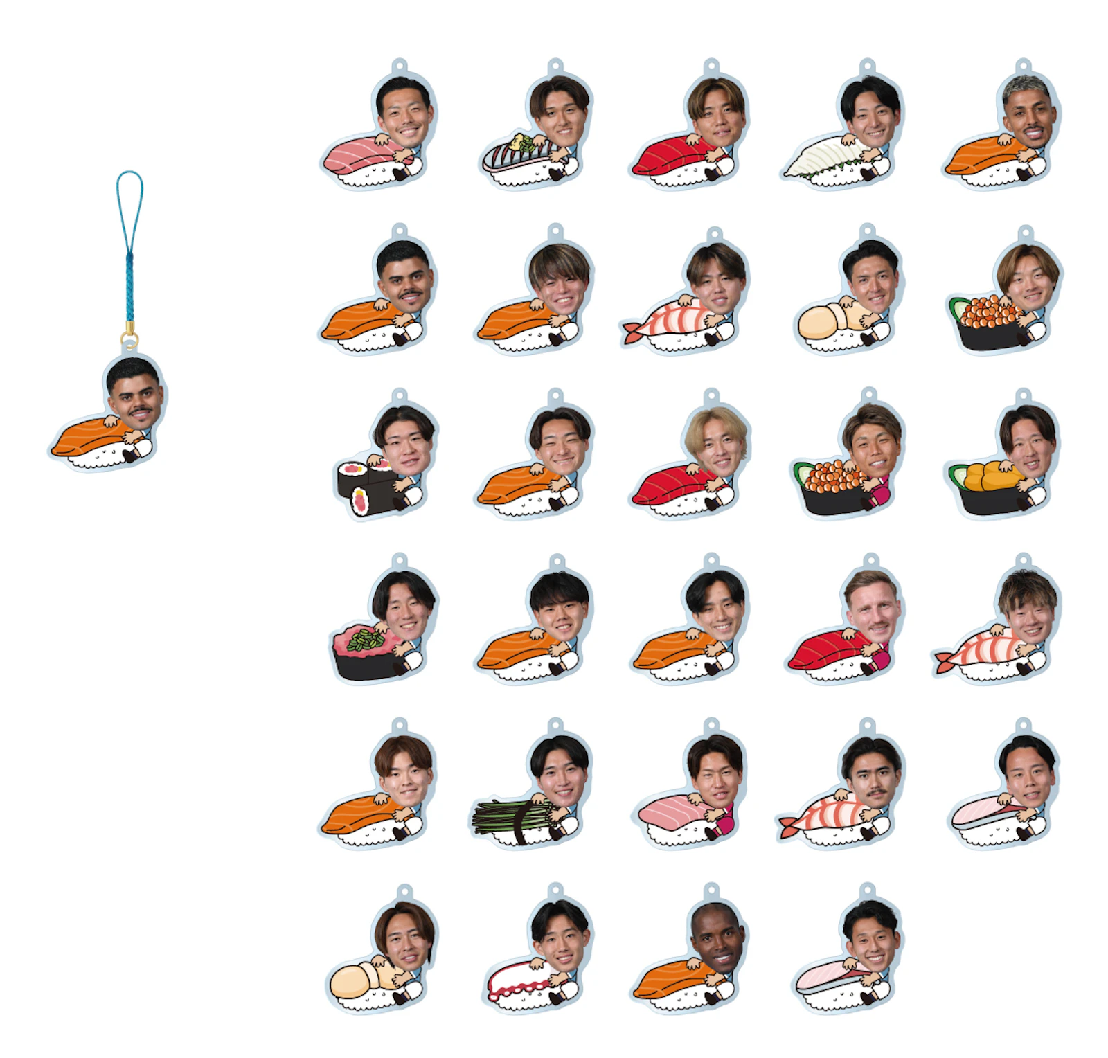 選手たちが好きなお寿司のネタに変身したキュートで美味しそうなキーホルダー!今回は通常のキーホルダーではなく、粋な「根付ストラップ」を採用。お寿司を食べる時に一緒に連れて行ってください!シークレットでの販売なのでどれが当たるかは開けてからのお楽しみ!