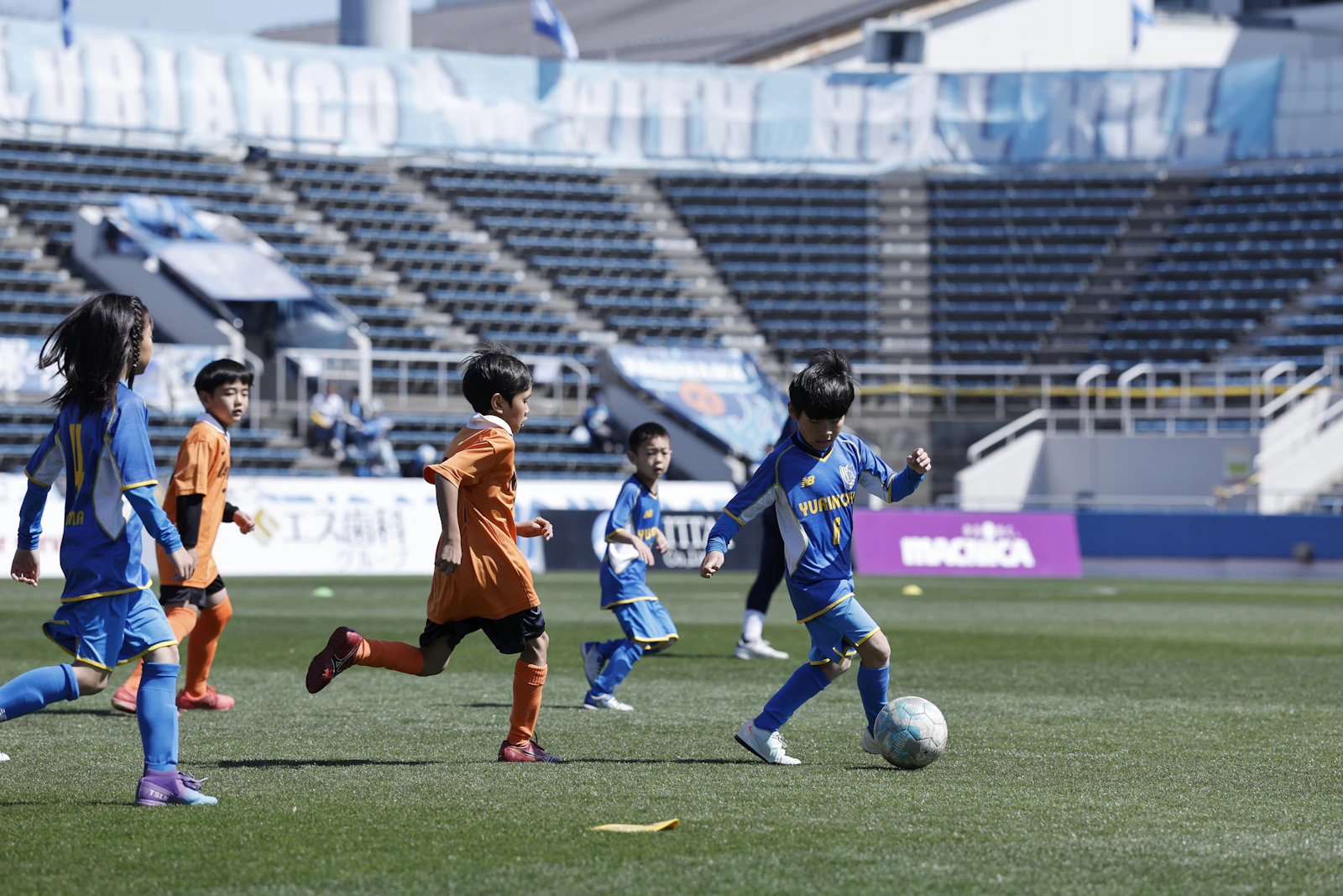 トップチームの試合が行われる前の三ツ沢のピッチで、前座試合を開催しています。