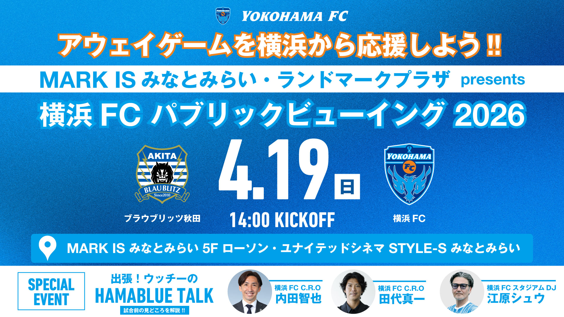 4月19日(日)に行われる2026明治安田J2・J3百年構想リーグ 第11節 ブラウブリッツ秋田戦の「パブリックビューイング」をオフィシャルパートナーであるMARK IS みなとみらいにて開催することが決定!