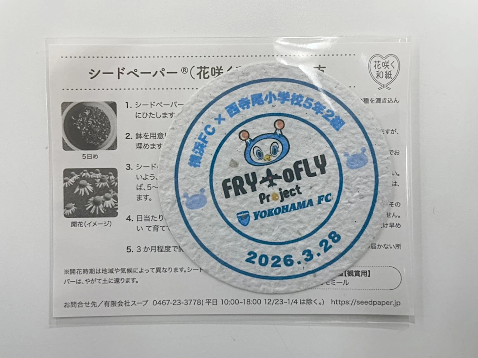 湘南ベルマーレ戦では、5年2組の皆さんと、活動をサポートしてくださっている日揮ホールディングスの皆さんと一緒に、家庭から出た油の回収ブースを運営しました。回収に協力してくださった方々へ感謝を込めて手渡したのは、サステナブルなノベルティとして用意した「シードペーパー」。この紙には花の種が埋め込まれていて、そのまま土に植えるとカモミールの花が咲くという素敵な仕組みになっています。さらに、その裏面には児童一人ひとりが心を込めて書いた直筆のメッセージが添えられていて、受け取った方々と子どもたちの間に温かい交流が生まれるきっかけにもなりました。