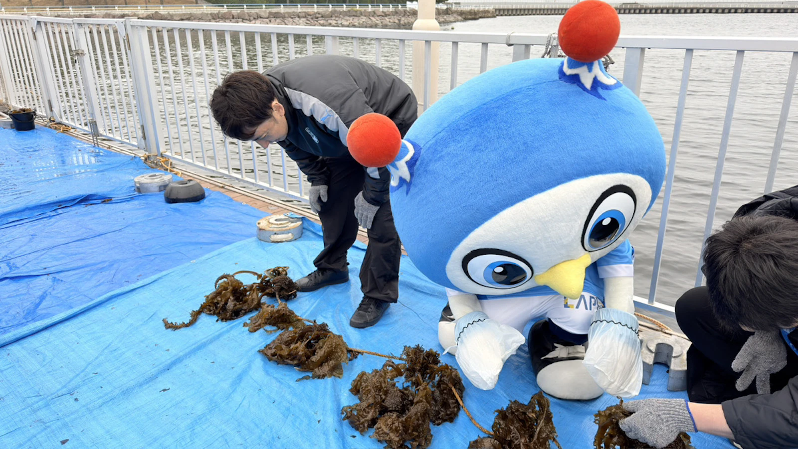イベントでは、この活動に欠かせない存在となった通称わかめお兄さんが登場!今年も「地産地消で輸送のCO2を減らすこと」や「ワカメが温室効果ガスを吸収してくれる仕組み」など、海を守る大切さを楽しくレクチャーしていただきました。ミニ講座の後は、いよいよ収穫タイム。収穫するのは、昨年12月にフリ丸、C.R.Oウッチー、クラブスタッフで植え付けを行ったワカメ。