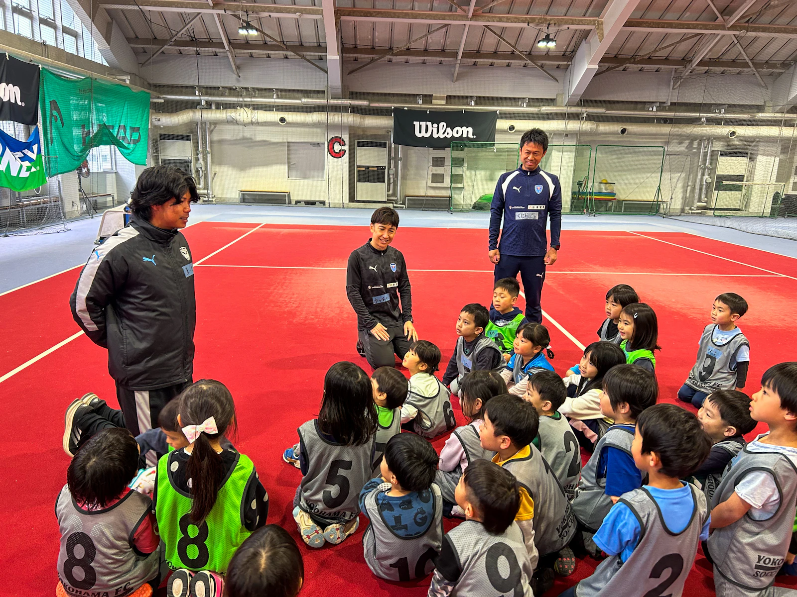 横浜FCは、メガロスの施設内にて年中から小学6年生を対象としたサッカー教室を実施。C.R.O内田智也と田代真一、普及ダイレクター鯨井健太が、サッカーボールを使った手軽な運動メニューを通して、体を動かすことの楽しさを伝えました。