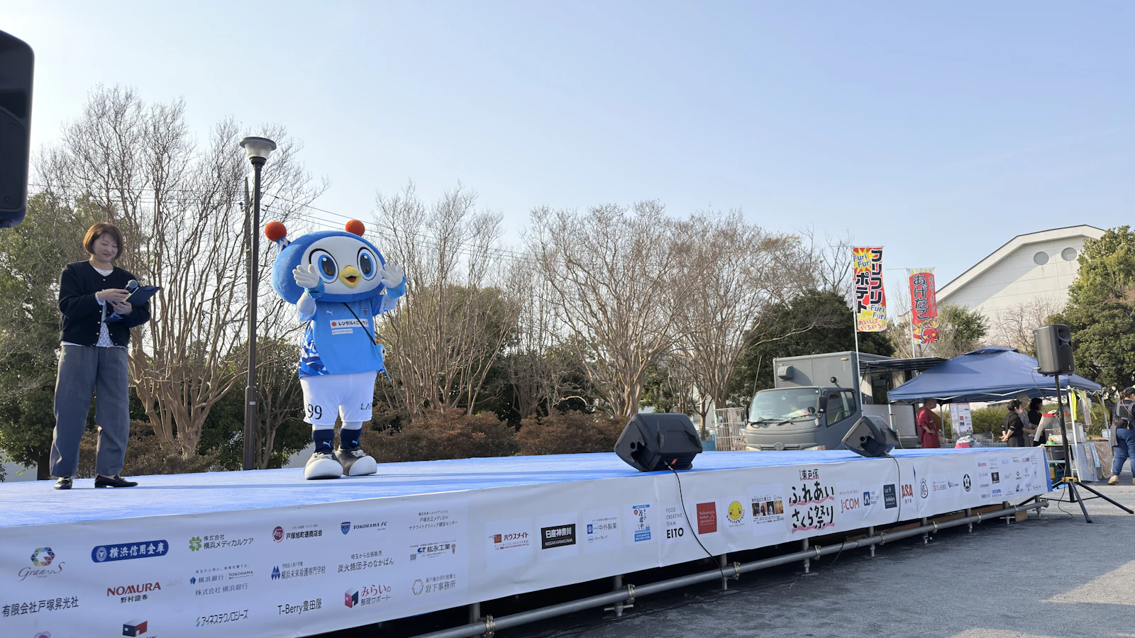 毎年3月の最終土日に実施している「さくら祭り」は、東戸塚商店会としても年間で最も力を入れているイベントとなり、近隣の地域住民、ファミリー層を中心に2日間での多く方々が来場します。今年も天候にめぐまれ、キッチンカーをはじめとした飲食や模擬店ブースが出店し、ステージイベントでも多種多様な地域の団体の方々が参加。横浜FCは2日目ステージイベントのラストで時間をいただき、フリ丸が登壇しホームゲームのPR、横浜FCの賞品をかけた「じゃんけん大会」を実施させていただきました。駆けつけてくださったファン・サポーターの皆さんはもちろん、お祭りに遊びに来られた子どもたち、地域の方々も大勢参加し、大いに盛り上がりました。