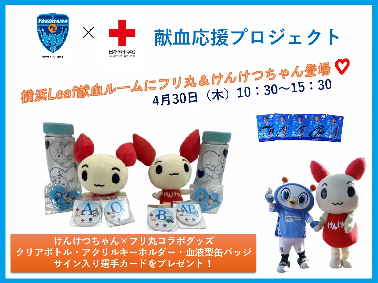 また、下記日程で横浜Leaf献血ルームに献血推進キャラクターのけんけつちゃんと横浜FCオフィシャルクラブマスコットのフリ丸が登場し、記念品のお渡しなどのお手伝いと広報活動をします。