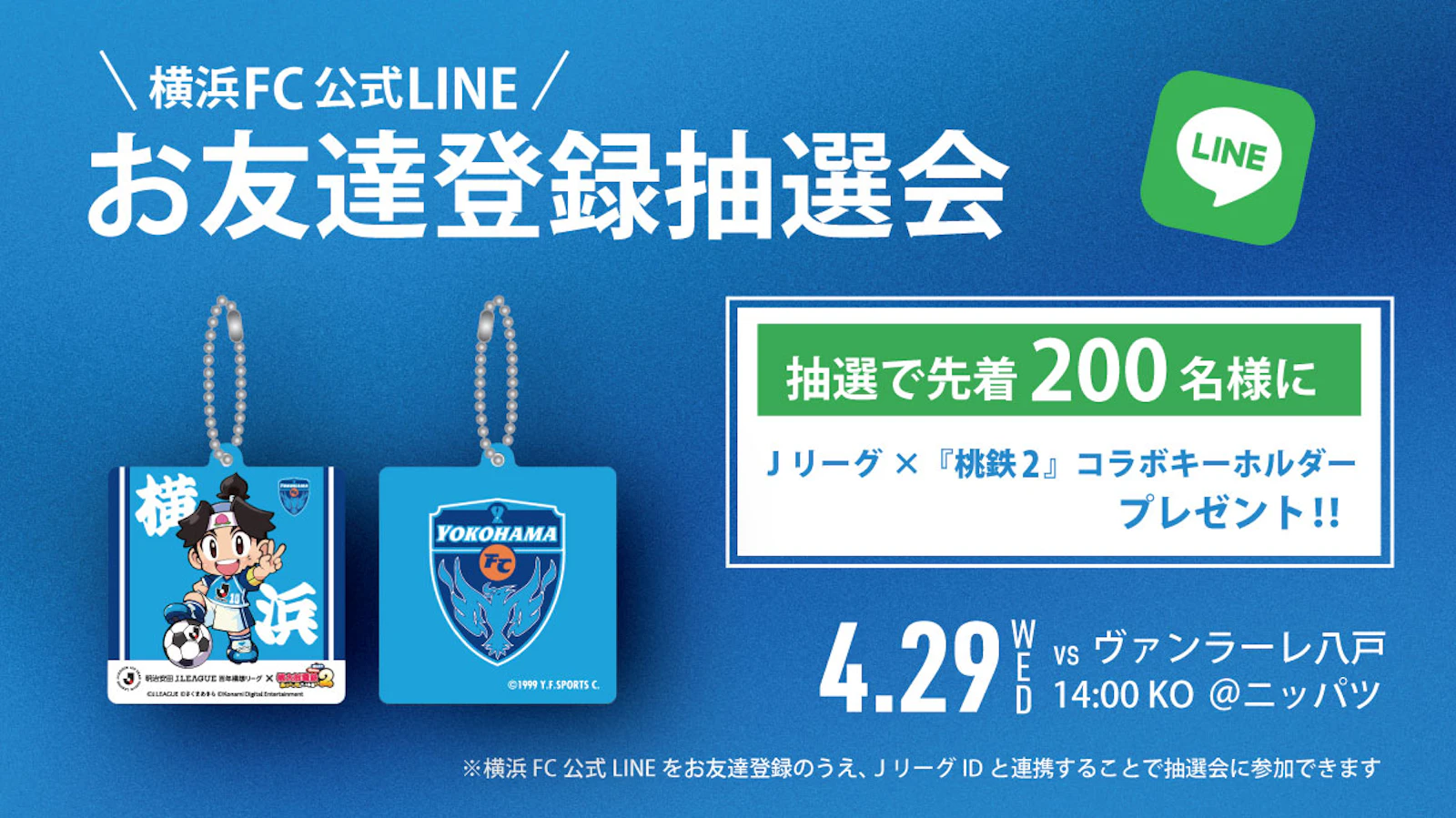 4月29日(水・祝)に開催されるヴァンラーレ八戸戦当日に開催されるLINE抽選会に参加してホームタウンである「横浜」が描かれた限定のキーホルダーをゲットしよう!