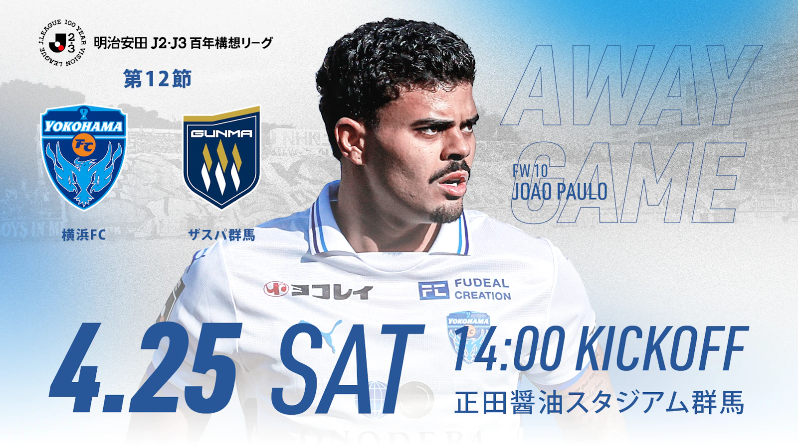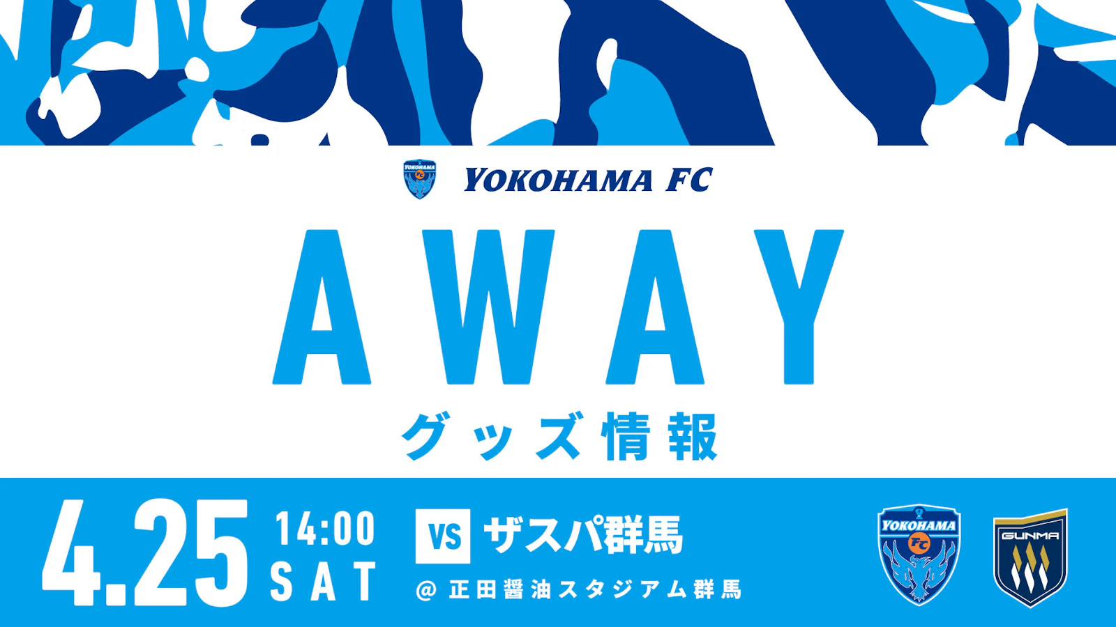 4月25日(土) 明治安田J2・J3百年構想リーグ 地域リーグラウンド 第12節 ザスパ群馬vs 横浜FC(14:00キックオフ/ 正田醤油スタジアム群馬)にて、横浜FCグッズを販売いたします。