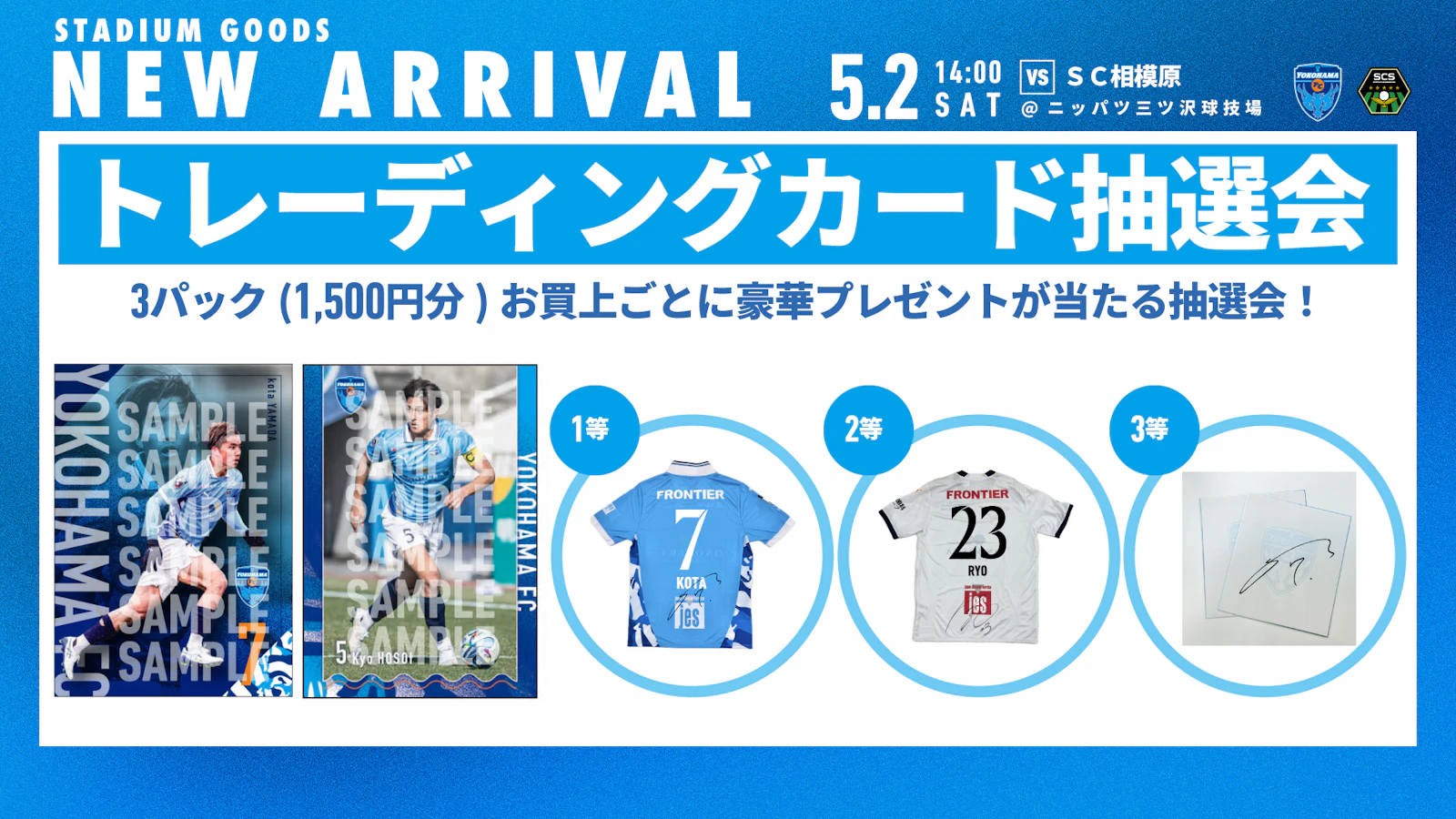※横浜FCグッズメガストア(メインスタンド側場外・平沼記念像付近)でもトレーディングカードはお買い求めいただけますが、抽選会への参加はできませんのでご注意ください。