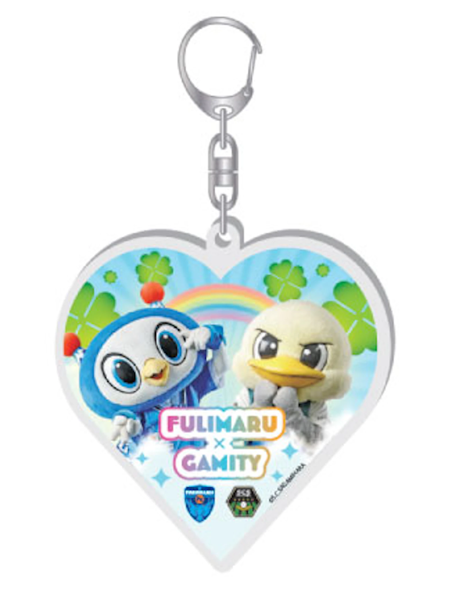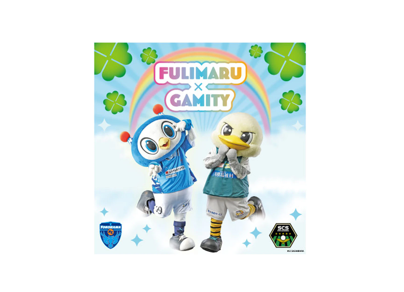 横浜FCのクラブカラー「水色」をイメージした澄み渡る青空に、SC相模原の「緑」を連想する四葉のクローバーを散りばめました。キラキラ輝く虹の架け橋が、フリ丸とガミティの絆を繋ぐ特別なデザイン。