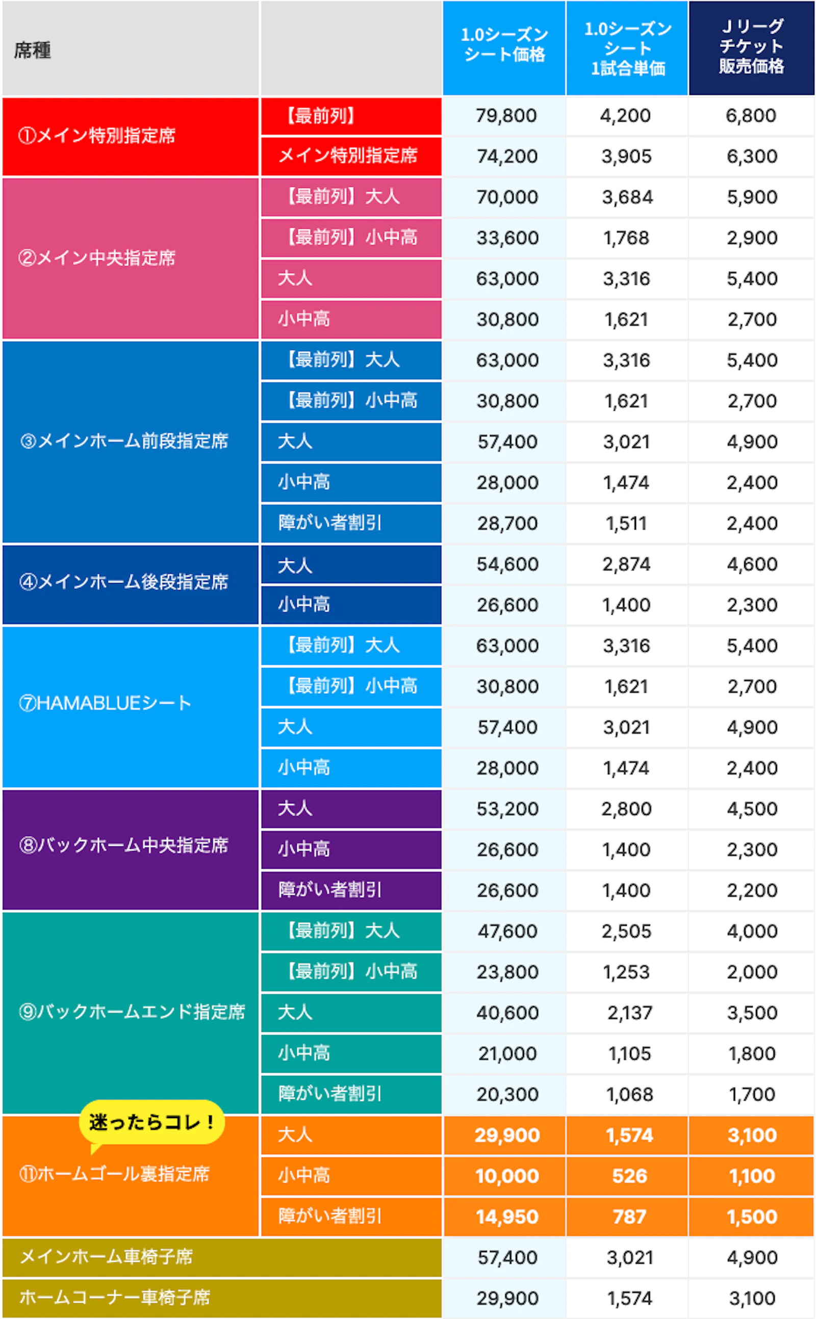 ・席割の変更に伴いバックホーム前段指定席(最前列を含む)の設置はございません。2025シーズンにバックホーム前段指定席(最前列を含む)のシーズンシートをお持ちで、2026‐2027シーズンも同じ席番をご希望の場合は、HAMABLUEシートまたはバックホームエンド指定席を選択の上で同じ席番をご選択ください。