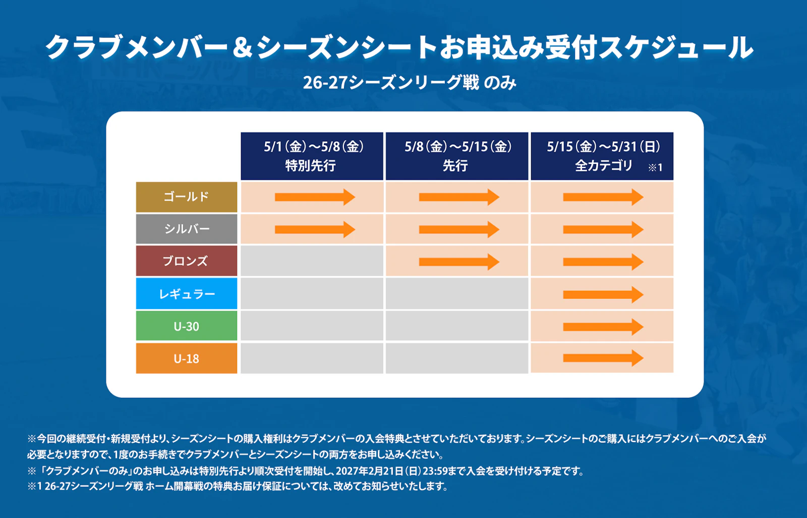 ※明治安田Jリーグ百年構想リーグ+明治安田Jリーグ26-27シーズン(1.5シーズン)のクラブメンバーのみの受付は、2026/5/17(日)23:59まで受付いたします。