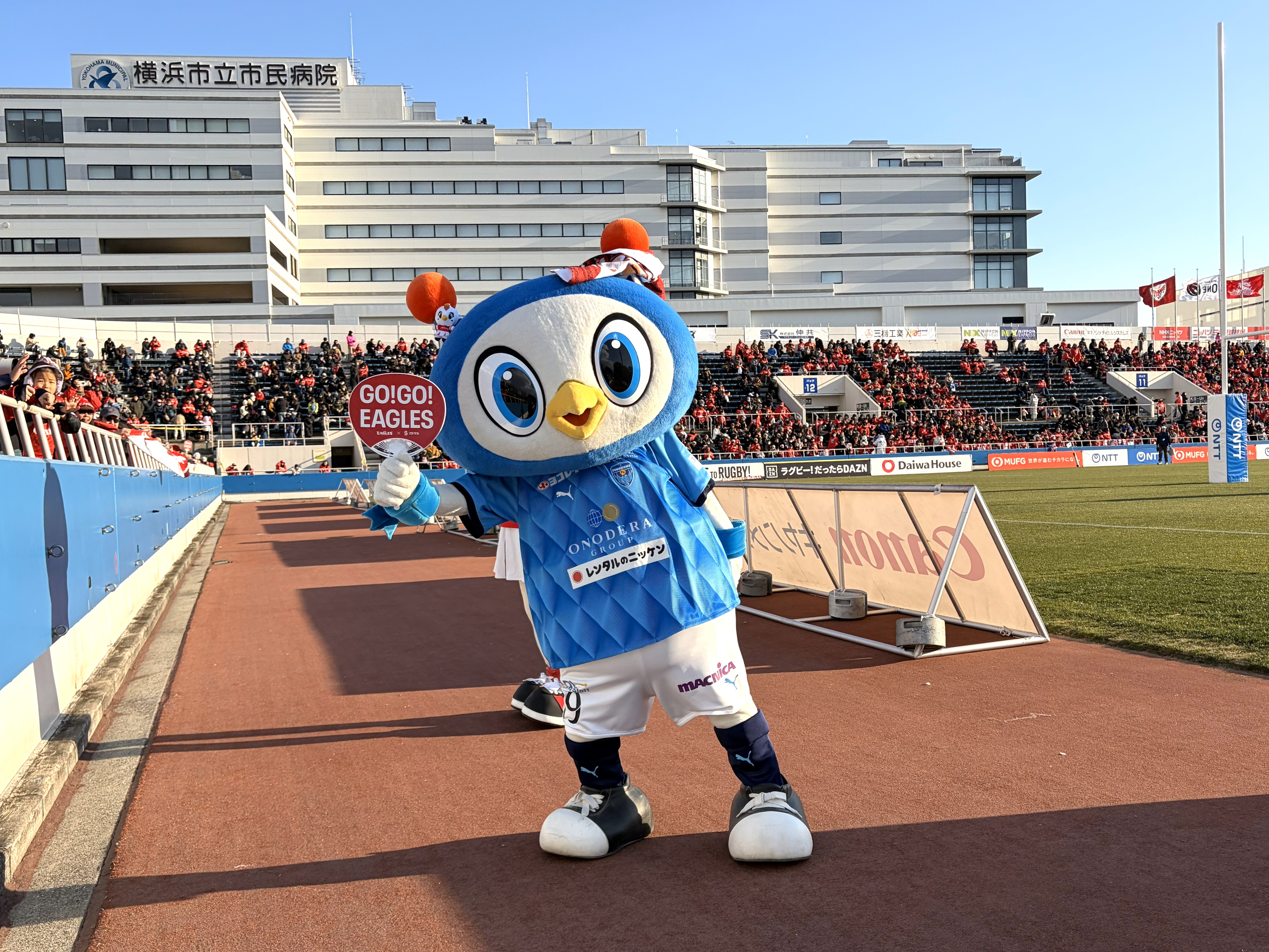 昨年に引き続き、同じ横浜市を拠点とするプロラグビーチーム「横浜キヤノンイーグルス」のホストゲームにフリ丸が応援に行きました!